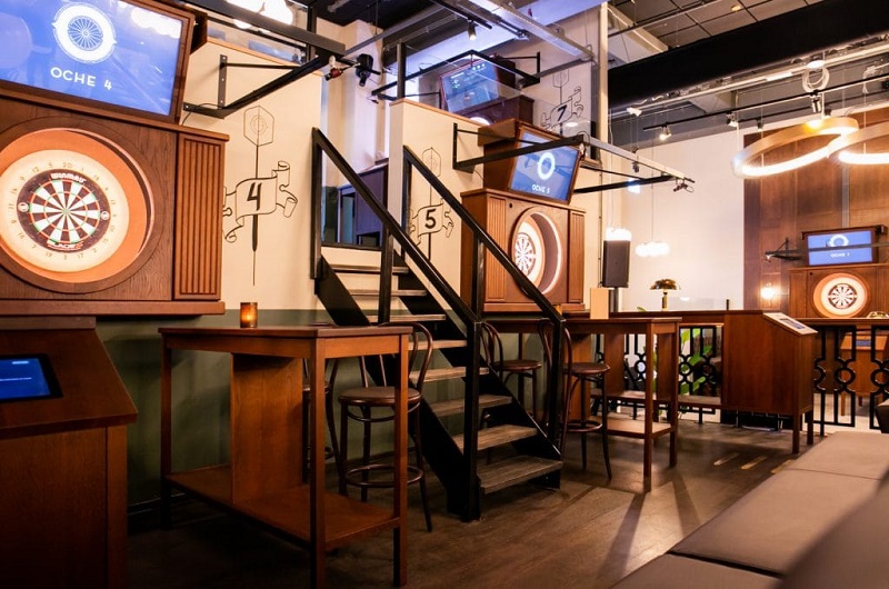 Each dart lane, known as an Oche, is equipped with a traditional dartboard, smart sensors that automatically track scores, a touchscreen to control the games, and a large screen displaying visuals such as target numbers and player leaderboards.